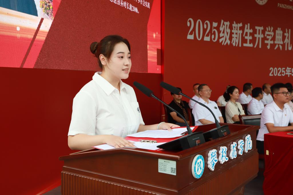 外国语学院2025级英语笔译专业硕士研究生张茜代表新生发言。她表示,作为一名新生将“归零前行、脚踏实地、融入集体、志存高远”,在阳光攀大书写“强国有我”的青春答卷。