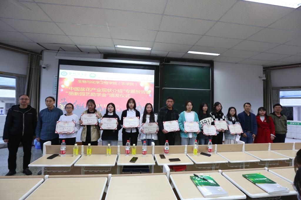 严春新和学院行政负责人为荣获“丽新园艺助学金”的十名同学颁发证书。