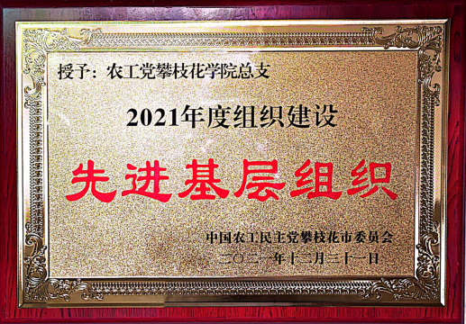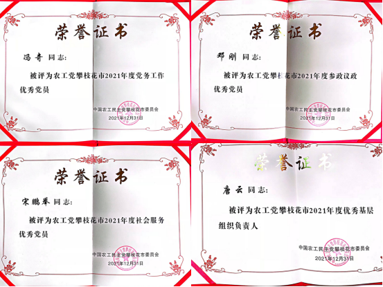 农工党攀枝花学院总支被评为“2021年度组织建设先进基层组织”,农工党攀枝花学院总支主委冯奇被评为“2021年度党务工作优秀党员”,副主委唐云被评为“2021年度优秀基层组织负责人”,委员邓刚被评为“2021年度参政议政优秀党员”,农工党党员宋鹏举被评为“2021年度社会服务优秀党员”。
