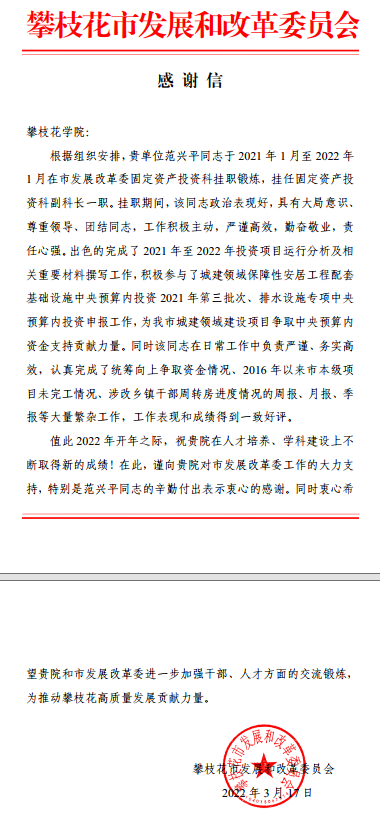 近日,我校收到了市发展和改革委员会写来的感谢信,对我校博士范兴平 2021 1 月至 2022 1 月在市发展改革委固定资产投资科挂职锻炼工作给予了充分肯定。