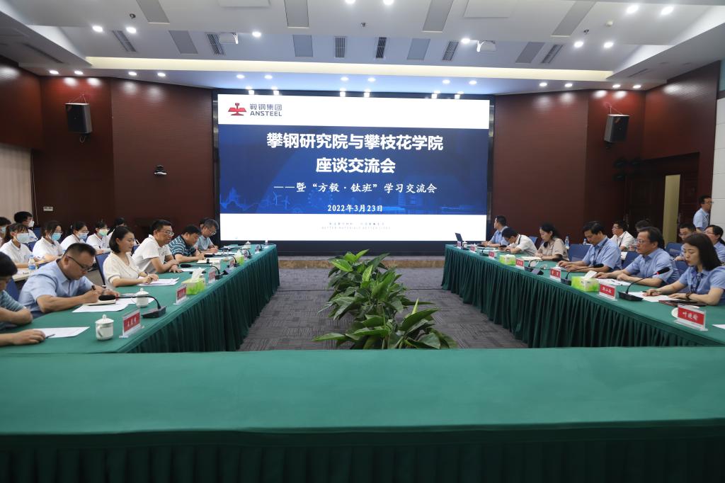 参观结束后,双方召开座谈交流会。会上,攀研院办公室主任苗庆东从单位的历史沿革、组织机构、人才结构、创新平台、创新成效等方面作了介绍。钒钛学院副院长蒋燕介绍了我校方毅·钛班人才培养模式和钒钛学院相关学科建设和科研工作情况。双方就钒钛科技创新、资源综合利用、产业链提档升级、科研协同平台建设、特色人才培养等方面进行了深入交流,并初步达成合作意向。