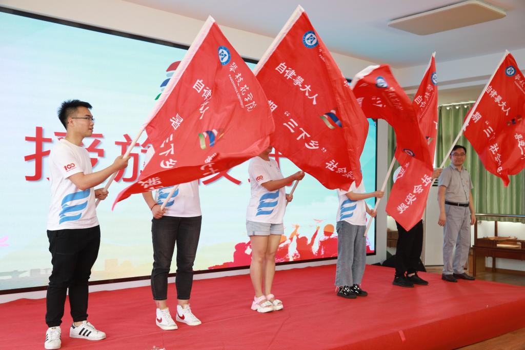 2021年社会实践学生谯寻、高子旋、邓川东,指导教师孙艳敏、王华、罗春秋分别就实践活动开展、实践报告撰写、实践论文投稿等做交流发言。与会领导为2022年暑期实践团队授旗。