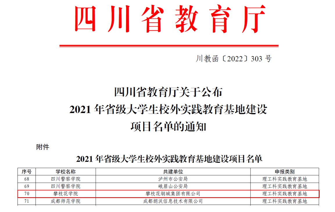 近日,四川省教育厅发布《关于公布2021年省级大学生校外实践教育基地建设项目名单的通知》,公布了2021年省级大学生校外实践教育基地建设项目名单。我校与攀枝花钢城集团有限公司联合申报的理工科实践教育基地成功获批立项。