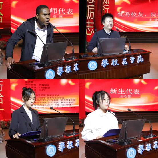 教师代表安澜表示,大学学习在于学无止境,鼓励学生要以学充实自我,走出舒适圈,找到更广阔的世界。优秀校友、院科研科科长王俊寄语师弟师妹们要学习勤奋努力,生活充满热情,保持自强自律。老生代表、2021年度国家奖学金获得者徐诗蕊激励学弟学妹们要坚定自律文明人格追求,用实际行动践行新时代“自律攀大人”的承诺。新生代表王心怡表示,要合理规划大学四年,树立明确目标,擦亮自律底色,砥砺奋斗,不负青春。