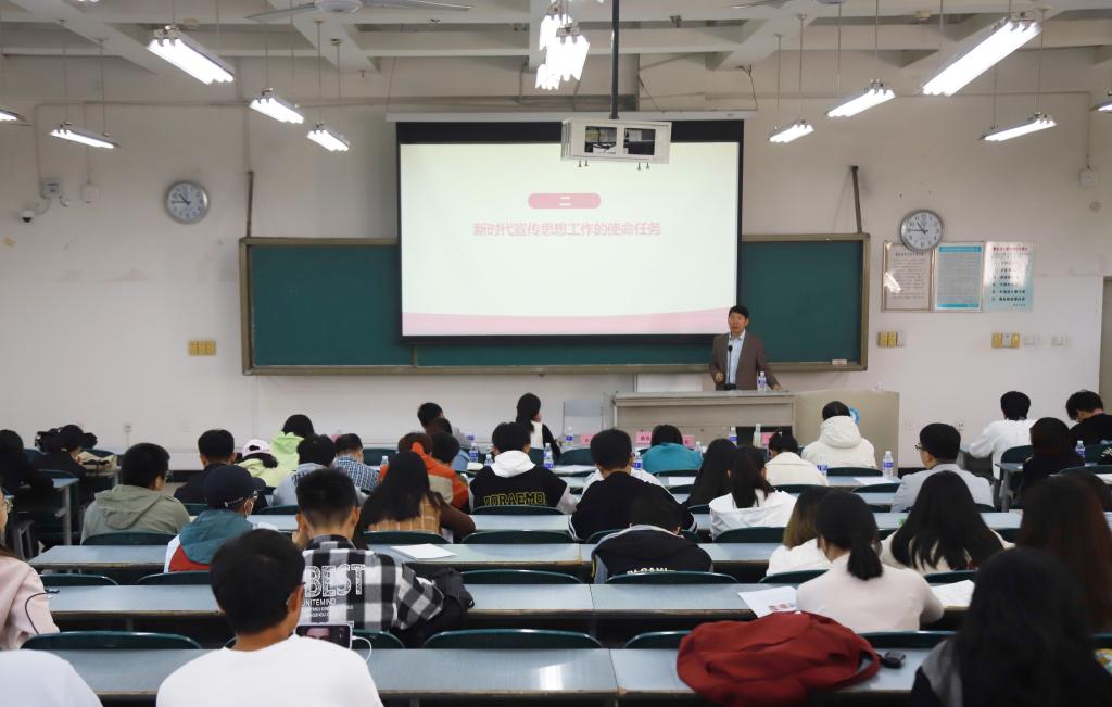 11月19日上午,党委常委、宣传部部长、统战部部长、马克思主义学院院长朱云生教授在二教2-4面向新闻宣传工作战线师生宣讲党的二十大精神。党委宣传部全体成员、各二级单位宣传员、传媒中心学生200余人参加讲座。