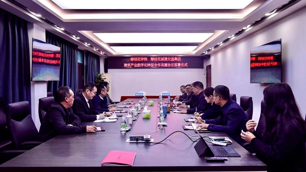 1123日上午,副校长石维富带队赴攀枝花城建交通(集团)有限公司开展校企合作交流,并签署建筑产业数字化转型合作共建协议。攀枝花城建交通(集团)有限公司党委书记、董事长赵路,党委副书记、总经理付朴忠参加签约仪式