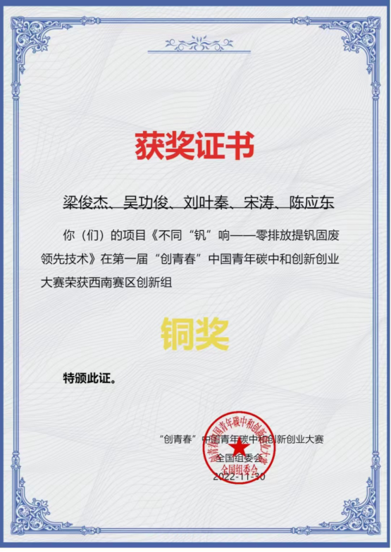 第一届“创青春”中国青年碳中和创新创业大赛于12月初评审结束,我院新能源科学与工程、冶金工程专业的刘源裴、梁俊杰、许平、赵兴宇、曾欣等学生在指导教师张士举、徐众、侯静和钟璨宇的带领下,斩获西南赛区创新组银奖1项、铜奖3项、优胜奖1项。