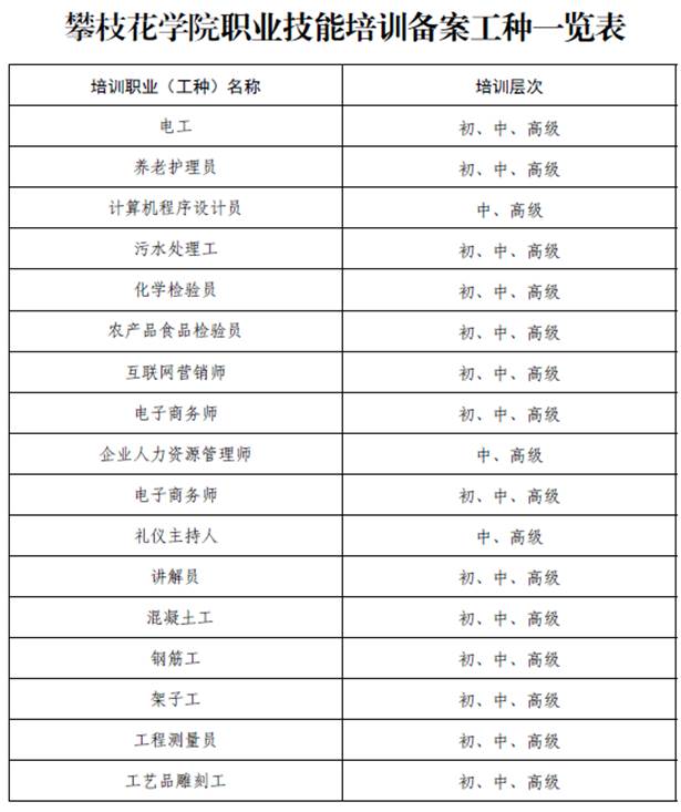 近日,攀枝花市人力资源和社会保障局对我校申报的职业培训备案申请进行批复,同意我校在备案职业(工种)及相应层级范围内开展补贴性职业技能培训。本次获批的工种涉及文、工、康养、艺术等共计有17项。