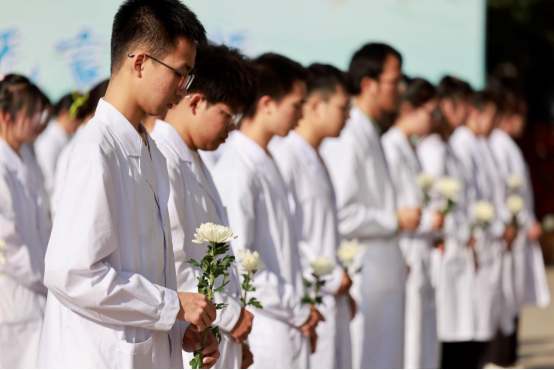 活动仪式上,全体医学生身着白大褂,手持素菊集体默哀三分钟,向“大体老师”鞠躬献花,表达对无私捐献者的尊重与哀思