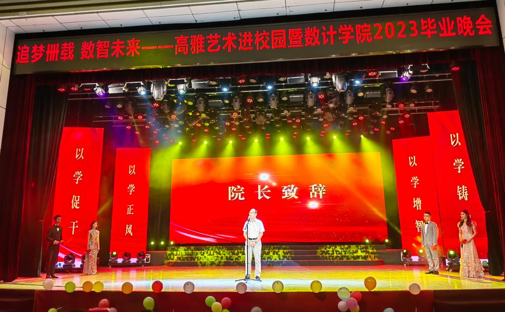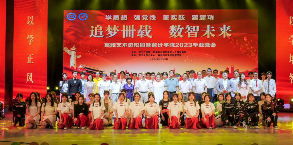 在全校上下深入开展学习贯彻习近平新时代中国特色社会主义思想主题教育之际,5月28日,数计学院在会堂举办“追梦卌载,数智未来”高雅艺术进校园暨数计学院2023毕业晚会。党委常委、副校长石维富,数计学院党政领导班子及师生代表800余人参加晚会。