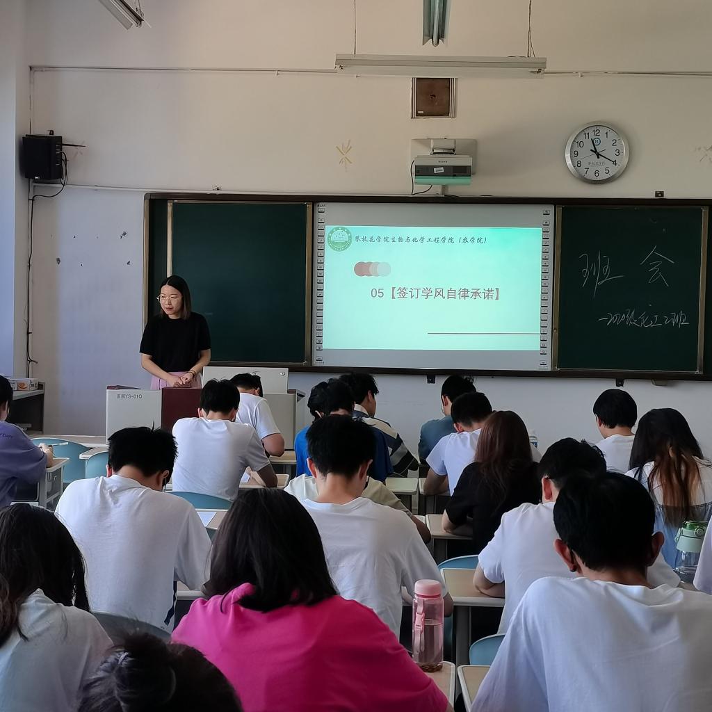 班主任解读学院学风自律承诺书,班级成员仔细阅读学习、生活、行为文明自律要求,签下学风自律承诺书,做自身文明行为的监督者、做学习自律的践行者。