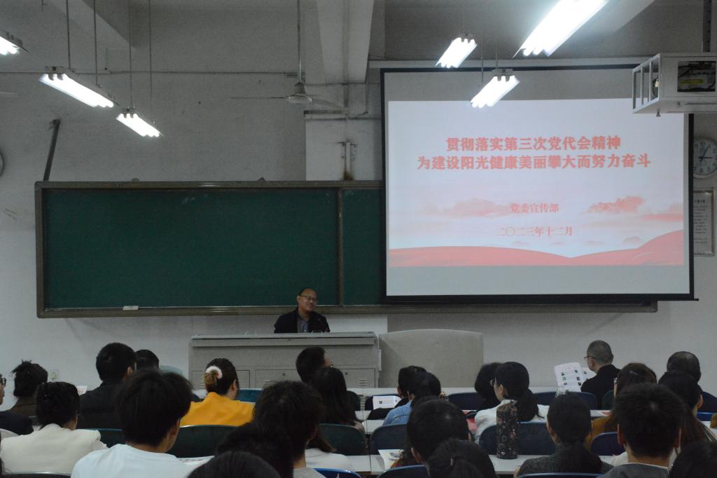 12月18日下午,为全面贯彻党的教育方针,服务高质量发展,落实学校第三次党代会精神,建设阳光健康美丽攀大。生化学院(农学院)于第二教学楼2-101举行第三次党代会精神的宣讲活动。校党委宣传部副部长方青松进行宣讲,生化学院教师党员和学生党员、入党积极分子100余人参与活动。