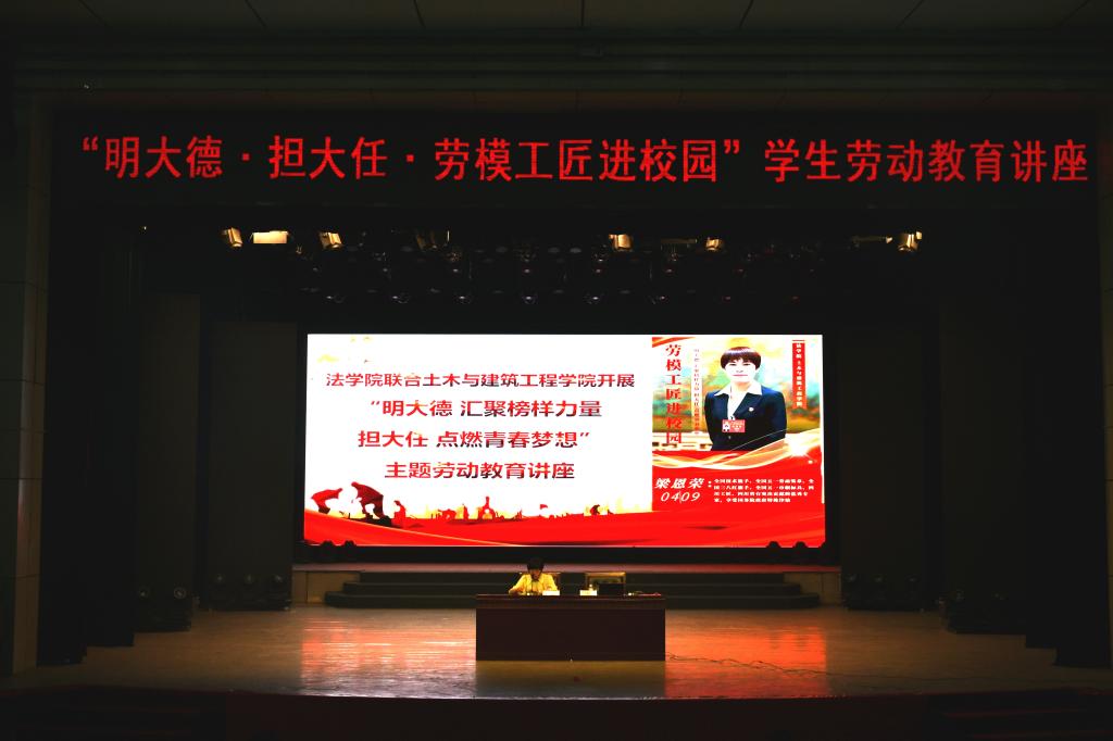 4月9日晚,法学院联合土木与建筑工程学院邀请党的二十大代表、全国技术能手、全国五一劳动奖章获得者、全国五一巾帼标兵、四川工匠、攀枝花市焊接技能大师工作室领办人梁恩荣在学校会堂开展“明大德·担大任·劳模工匠进校园”学生劳动教育讲座。学院师生共计800余人参加讲座。讲座由法学院党委负责人主持。