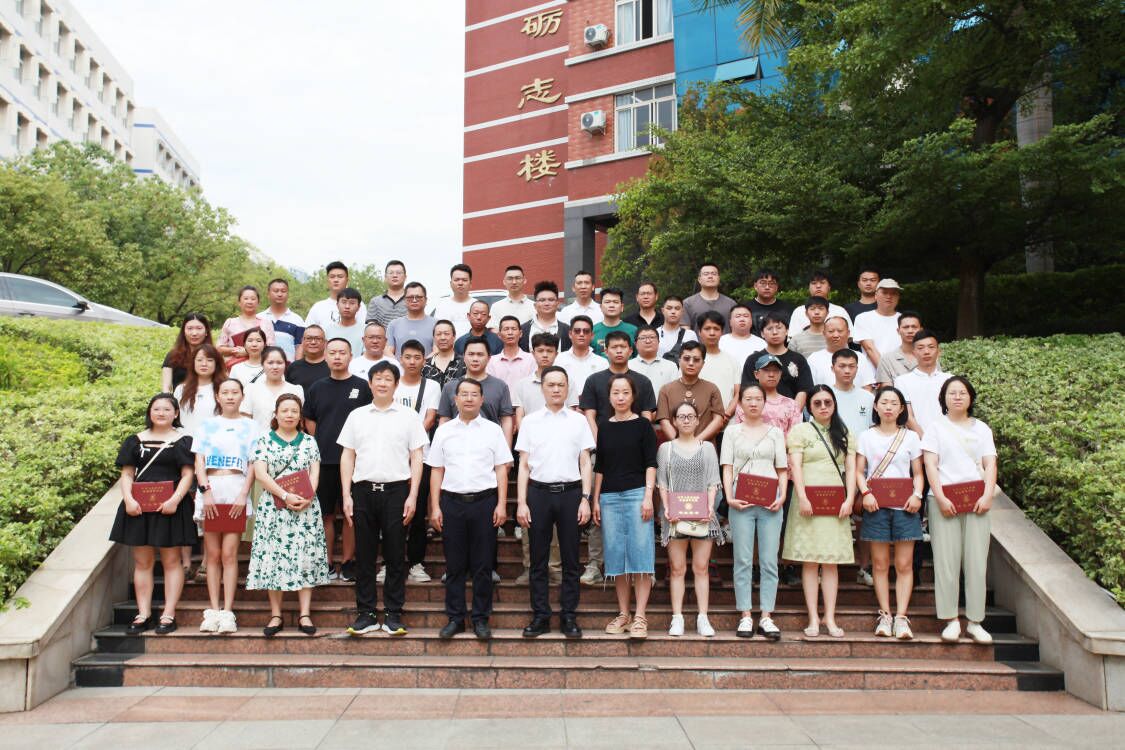 学院党委书记张敬东、院长孙金坤为毕业生颁发毕业证,全体参会人员在励志楼门口合影留念。
