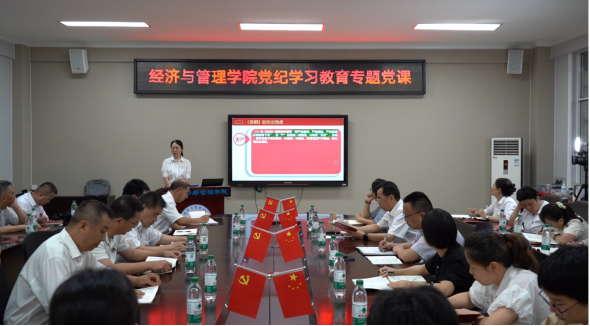 在“七一”党的生日来临之际,为推进党纪学习教育走深走实,以严明的纪律推动学院工作高质量发展,7月1日上午,经济与管理学院党委召开全院党员大会,学院党委书记陶睿作了《锤炼党性恪守党纪 以严实作风推动学院事业高质量发展》为题的专题党课,校党委委员、副校长张旭辉到会指导并作重要讲话。