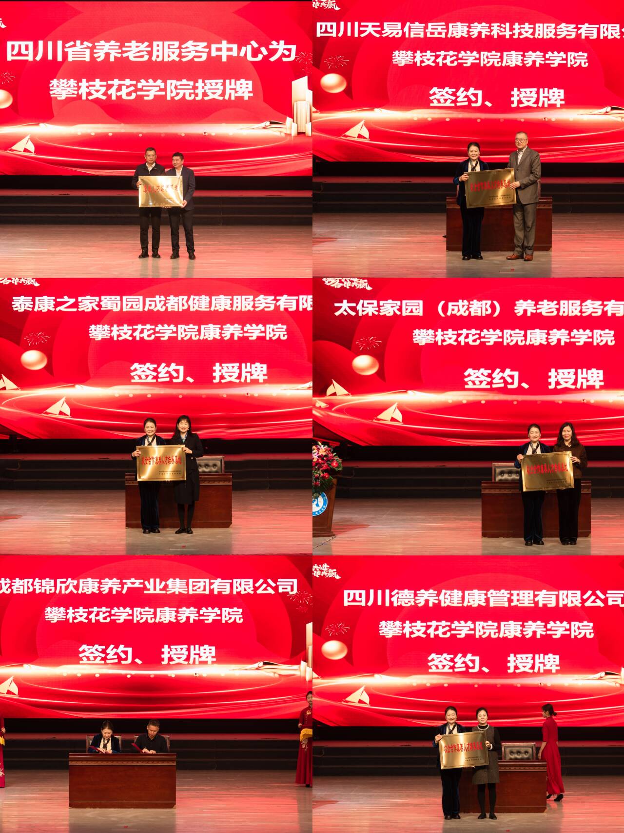 校企合作康养人才培养基地签约及授牌环节,四川省养老服务中心为我校授牌,进一步深化政校合作;成都锦欣康养产业集团有限公司、泰康之家蜀园成都健康服务有限公司、太保家园(成都)养老服务有限公司、四川天易信岳康养科技服务有限公司、四川德养健康管理有限公司分别与康养学院完成签约及授牌,标志着多方将在人才培养、实习实训、就业创业等领域开展深度合作,为康养专业学生搭建“学习-实践-就业”一体化成长通道。