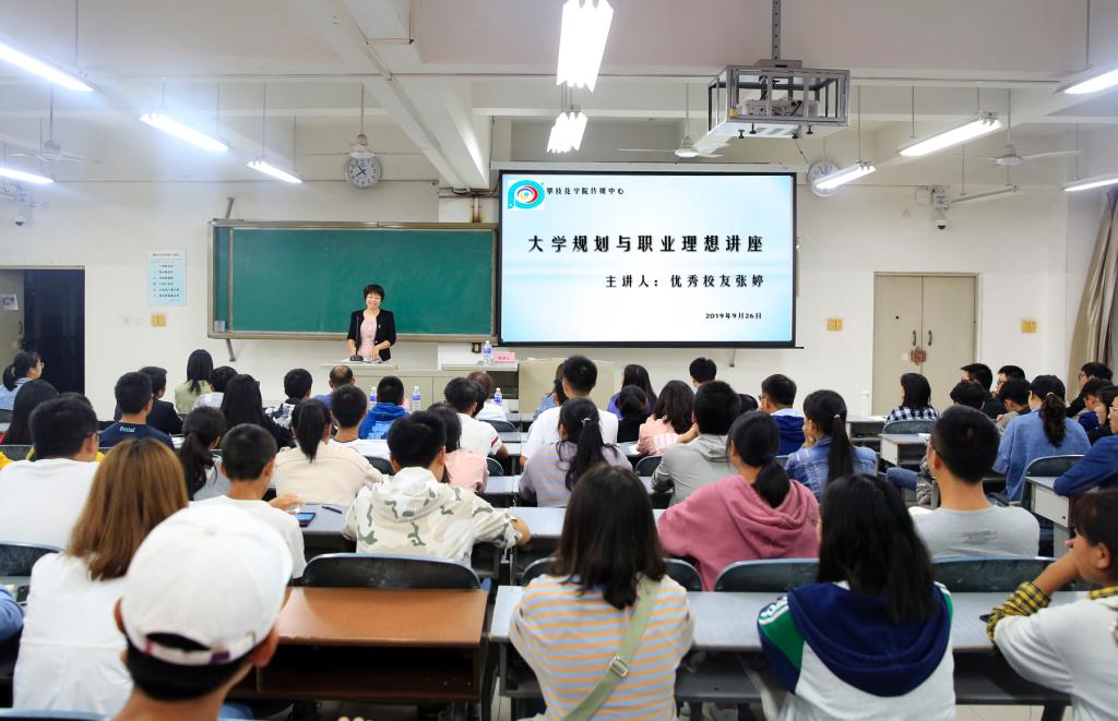 926日晚,传媒中心邀请外语学院2018届优秀校友张婷在二教2601为同学们做《大学规划与职业理想》专题讲座。党委宣传统战部老师、传媒中心学生干部以及2019级新生200余人听取讲座。