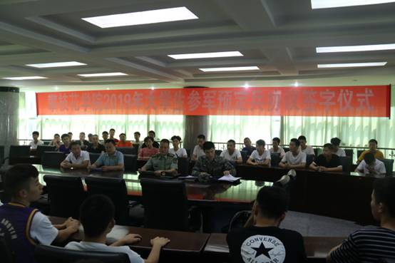 6月20日下午,2019年大学生参军预定兵签字仪式在办公楼五楼会议室举行。东区人民武装部部长康贺卫、学生工作部部长周传兴,51名预定兵参加了本次签字仪式。