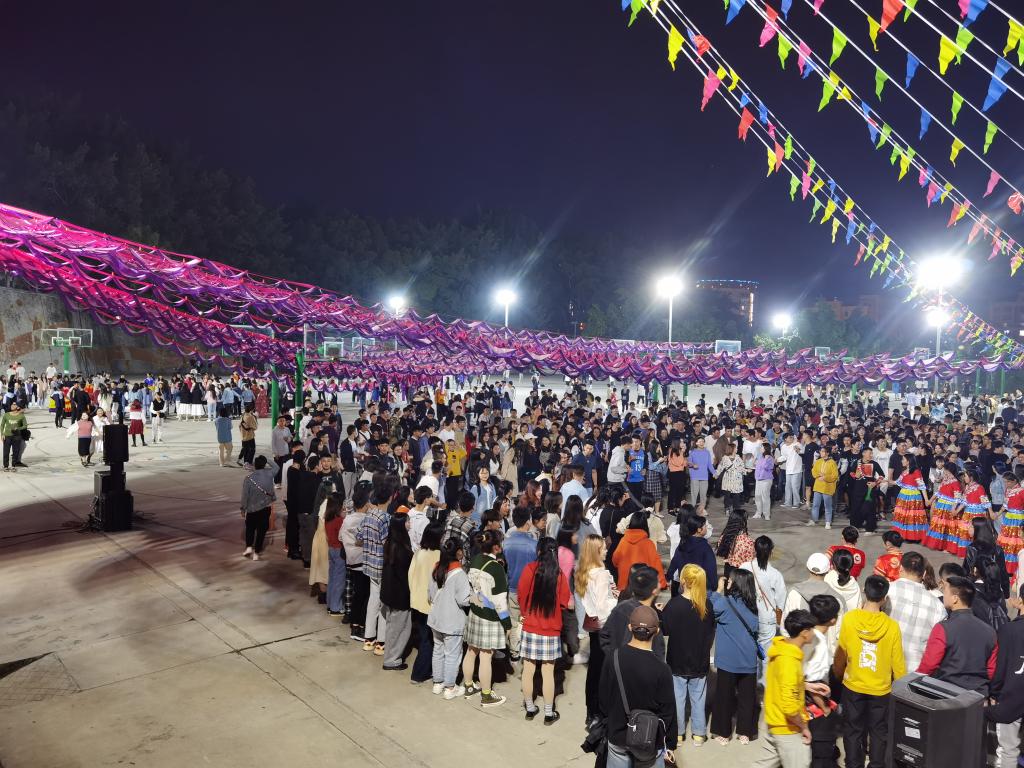 篝火晚会把篮球场变成了欢腾的海洋,进一步加强了各民族同学之间的沟通与交流,增强各民族同学间的团结意识和友爱情谊;同时让各民族同学进一步了解彝族的文化风俗,也让彝族同胞们深刻感受到来自校园家庭的温暖。